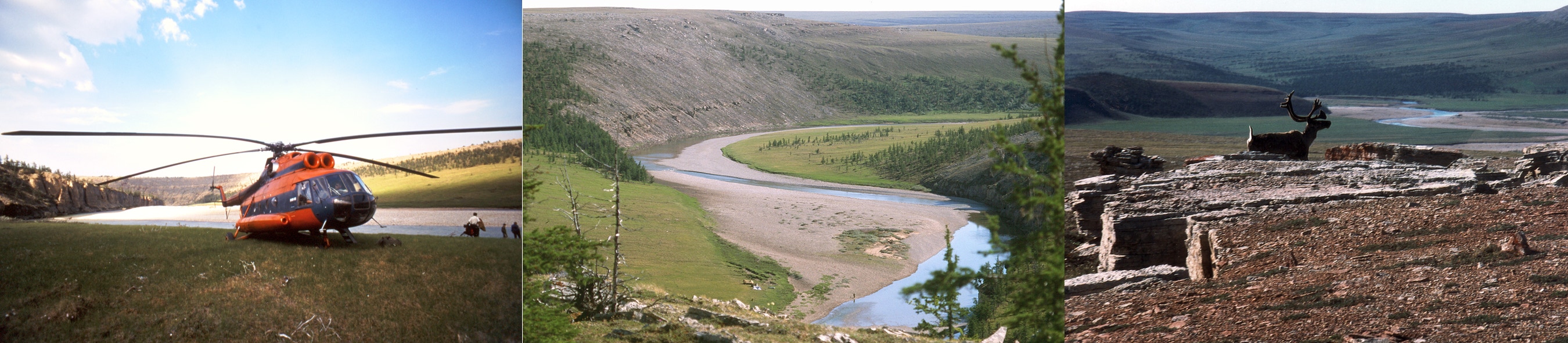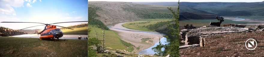 From left to right: Helicopter bringing the team to the locality, view from opposite side, reindeer