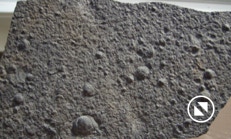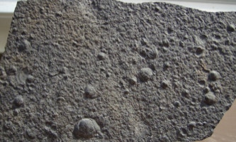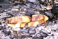 Left: Orsten' nodule embedded within alum shales (same quarry as above). Often the nodules are surrounded by a crystallitic crust of limestone.