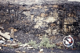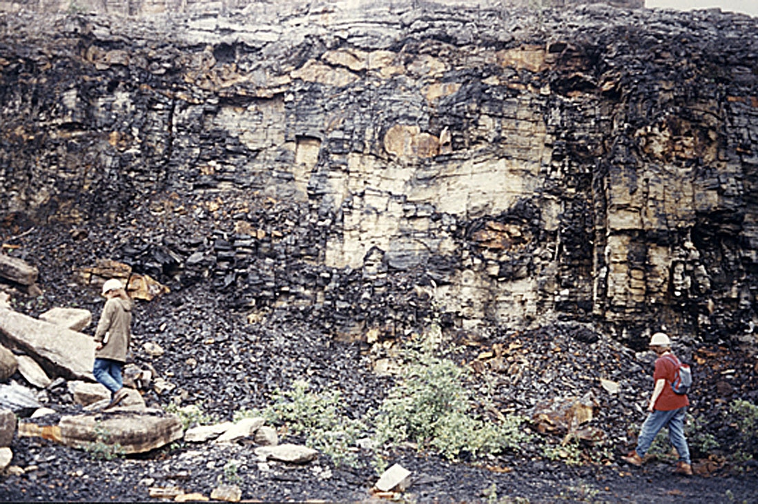 Left: Quarry near Falbygden, Västergötland, Sweden. Exposed are the Furongian and Lower Ordovician. Lower part with black, organic-rich alum shales (alunskiffer in Swedish), topped by a hiatus of 0.5 m, and 1–1.5 m mudstones forming the basis of the Tremadocian (Ceratopyge shales). Above, banked Ordovician limestones (Latorp limestone). 'Orsten' nodules within the shales. In this region, post-Cambrian dolerite caps have protected the less erosion resistant Alum Shales and other Palaeozoic strata, forming the characteristic table mountains ("Tafelberge") of Västergötland, most notably Kinnekulle. Photograph: Dieter Waloszek 1989 – site now "destroyed" due to recreation activities after the quarry had been expired.