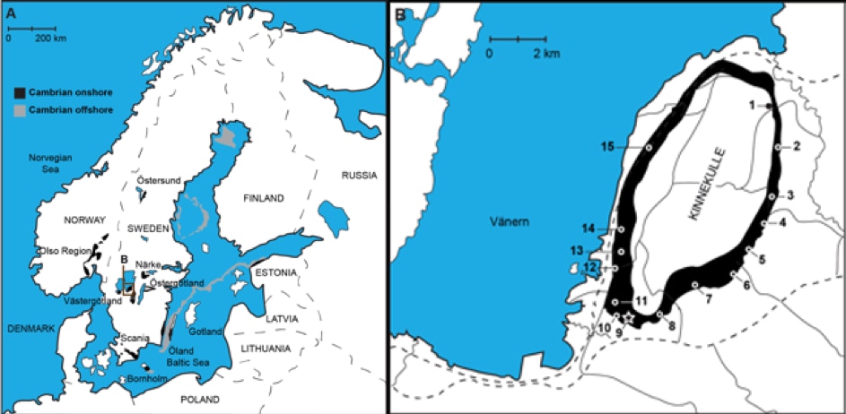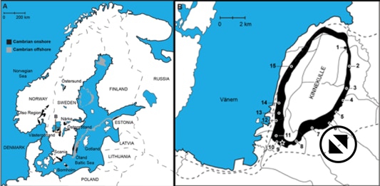 Above: Occurrence of 'Orsten' rock in Scandinavia (left) and around the hill Kinnekulle at lake Vänern, Västergötland (from Castellani et al. 2018. (9) on right map: the famous locality Gum, now a nature reserve).