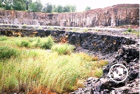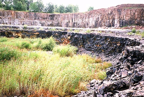 Left middle: The surrounding alum shales, as here from a quarry in Skåne, Sweden, are a finely layered compaction series of up to 100 m – mostly much less – of bituminous shale with a notable heavy-metal content (see e.g.: Buchardt, B. 1989. Irradiation of organic matter by uranium decay in the Alum Shale, Sweden. Geochimica et Cosmochimica Acta 53(6),1307-1322.).