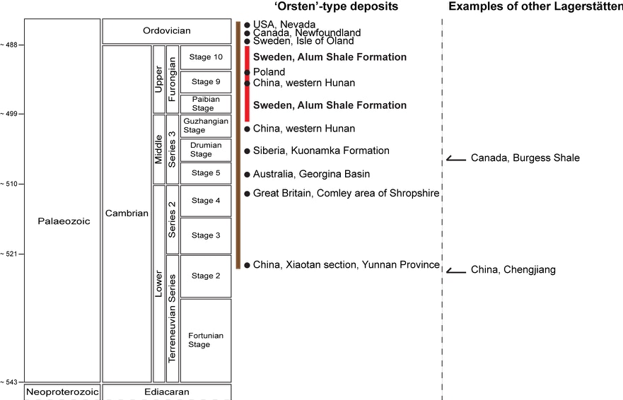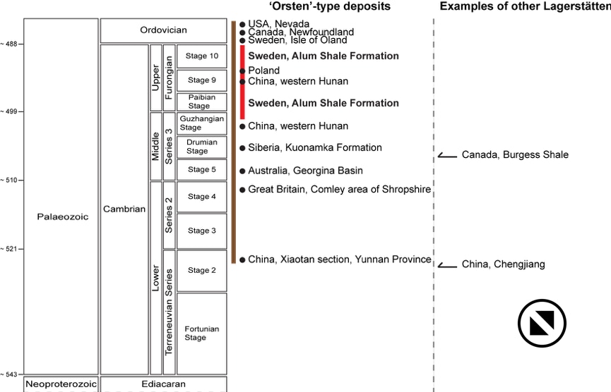 Timescale with 'Orsten'-type finds: brown, total range; red, Swedish occurrences.