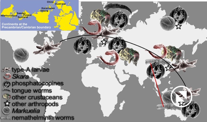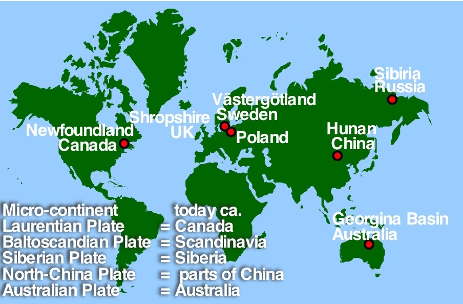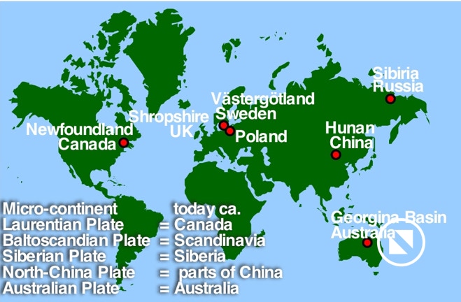 When plotting the occurrence of different 'Orsten' fossils on a world map, it becomes evident that these reflect the continent situation in the Cambrian quite well. After the break-up of the large super continent Rodinia at the end of the Precambrian, a number of smaller continents lay like pearls along a line near the equator, north of the remaining Gondwana continent. Remarkably, no 'Orsten'-type fossils have been reported from the continental areas around Gondwana so far, though the so-called "small shellies" are numerous (more on these in due course; see, e.g. papers by O. Elicki). The zero record of 'Orsten'-type fossils from any of the coasts around the Gondwana continent requires further consideration.