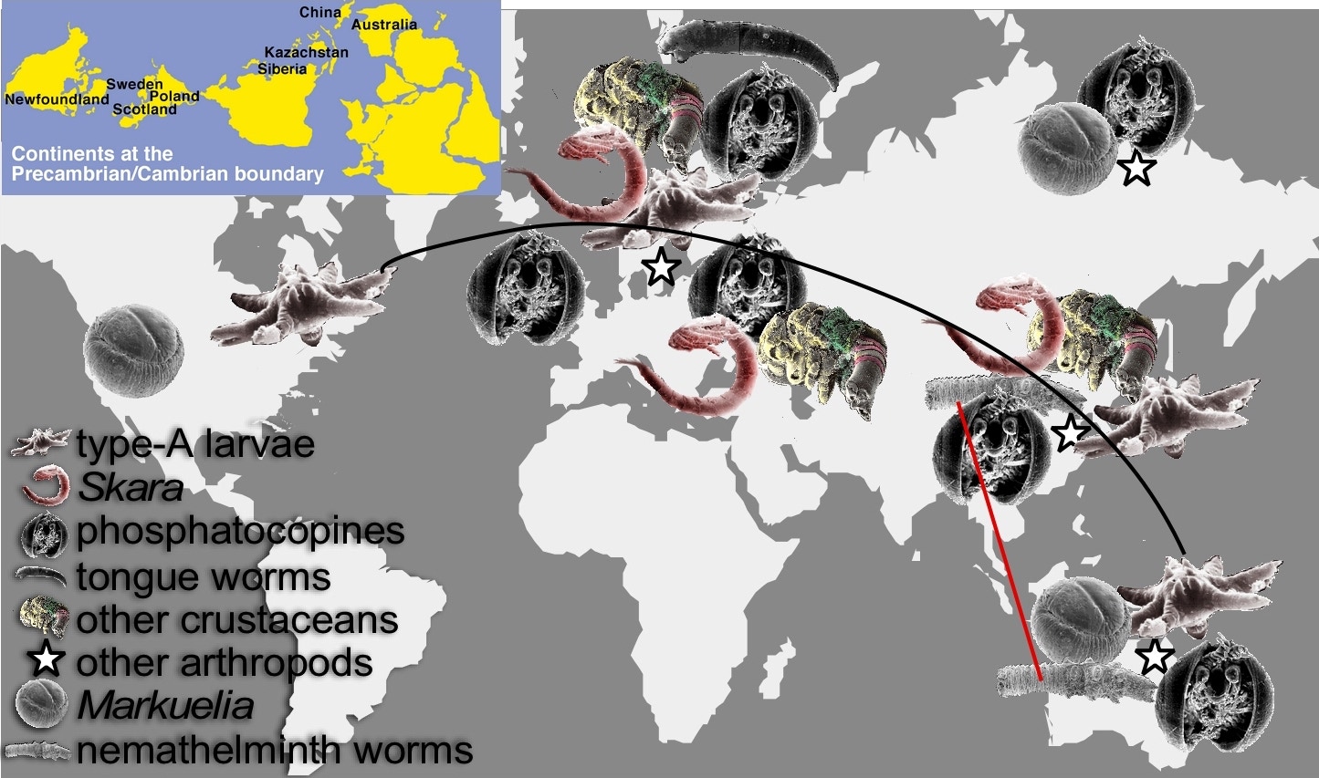 Species recognized as derivatives of the stem lineage to Crustacea were reported so far only from Sweden (all upper middle Cambrian). The eucrustacean Skara was reported from Europe and China, with a geological range from the upper middle Cambrian (Sweden, Poland) to the Furongian (China). Other species assigned to Eucrustacea are also known only from Sweden (upper middle Cambrian to late Furongian) and China so far, but there from the Lower Cambrian. Again, micro-lobopodian "stem" arthropods (Arthropoda s. l.) in 3D preservation are known only from Sweden (1 species) and China (unpublished). Yet, their macroscopic counterparts have been reported in flat preservation from the North America to northern Greenland (Hadranax augustus, see Budd & Peel,1998), Europe (Xenusion auerswaldae) and China (>10 species). Considering also certain micro-fossils called Microdictyon in small-shelly assemblages around the globe, which could be identified as plated cuticular elements of lobopodians, the range of lobopodians must be apparently much wider. Water bears or tardigrades, another "stem"-arthropod group, are known from possibly series 2, formerly Middle Cambrian, of Siberia (still to be described taxonomically), but at least one unpublished specimen from China hints again at the strong connection between Siberia and China. The third group of stem-arthropods, tongue worms or Pentastomida, has been discovered, so far, only in Sweden, with a short geological range from the late Cambrian to the Lower Ordovician (Andres 1989). Remarkably, these do not occur together with any of the other arthropods, but only with tooth elements, conodonts, of conodontophorids, fish-like craniote euchordates ("not-yet" vertebrates). This might give some information on their occurrence and life strategies, and their long-lasting host/parasite association with craniotes – and NOT with arthropods (contrasting Siveter et al. 2105, depicting, in our view, a piece of dirt but not an animal).