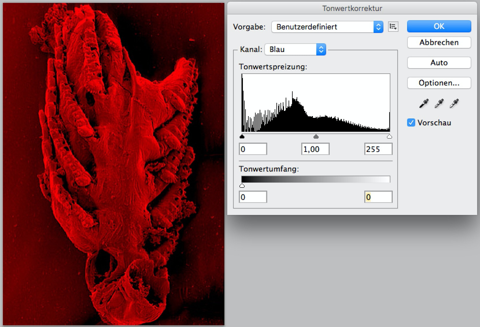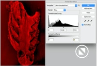 - 3. Open the left of the images, then, if not done already, turn each partial image into RGB mode to make them coloured = 24 bit (3X8 bit). Then open the tone correction tool (Apple or Cmd L on a Mac, most likely a similar short cut on a PC). The red one will be the future underlying one. Choose the channel scrollbar and wipe out green and then the blue by choosing the lower horizontal bar (not the one underneath the histogram). Just pull it to zero and you will see the effect, a red image.