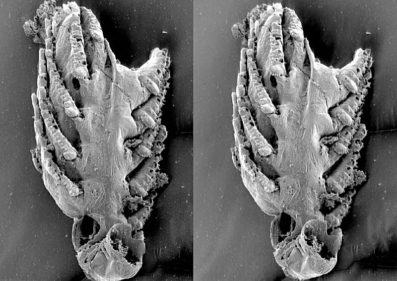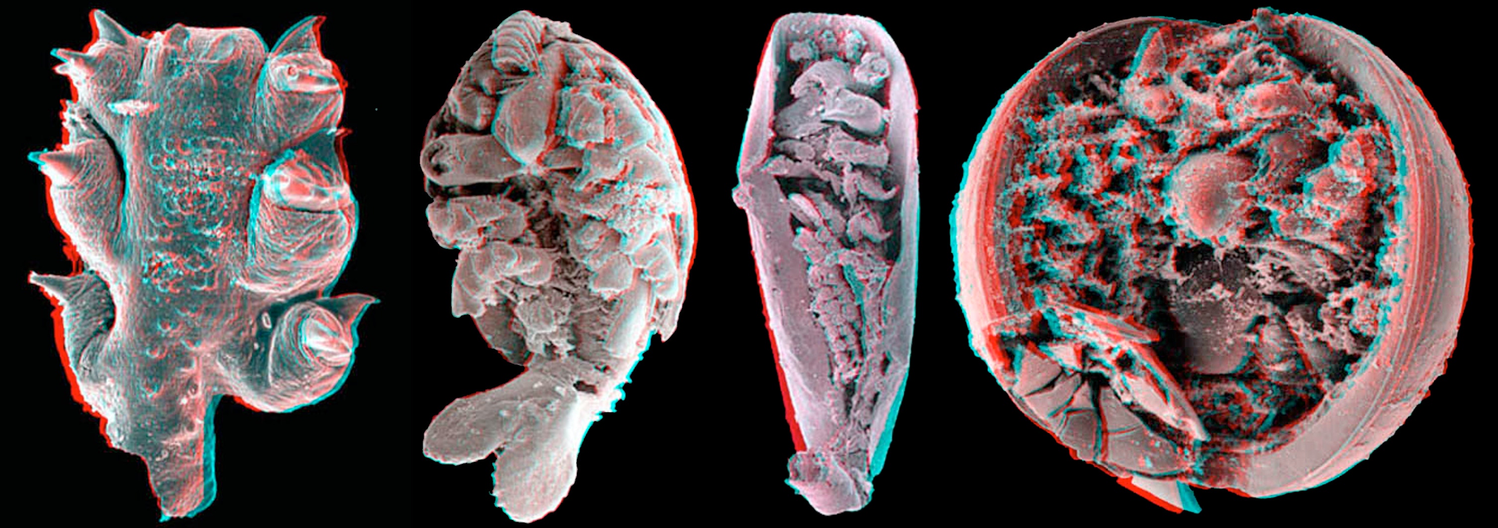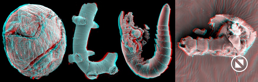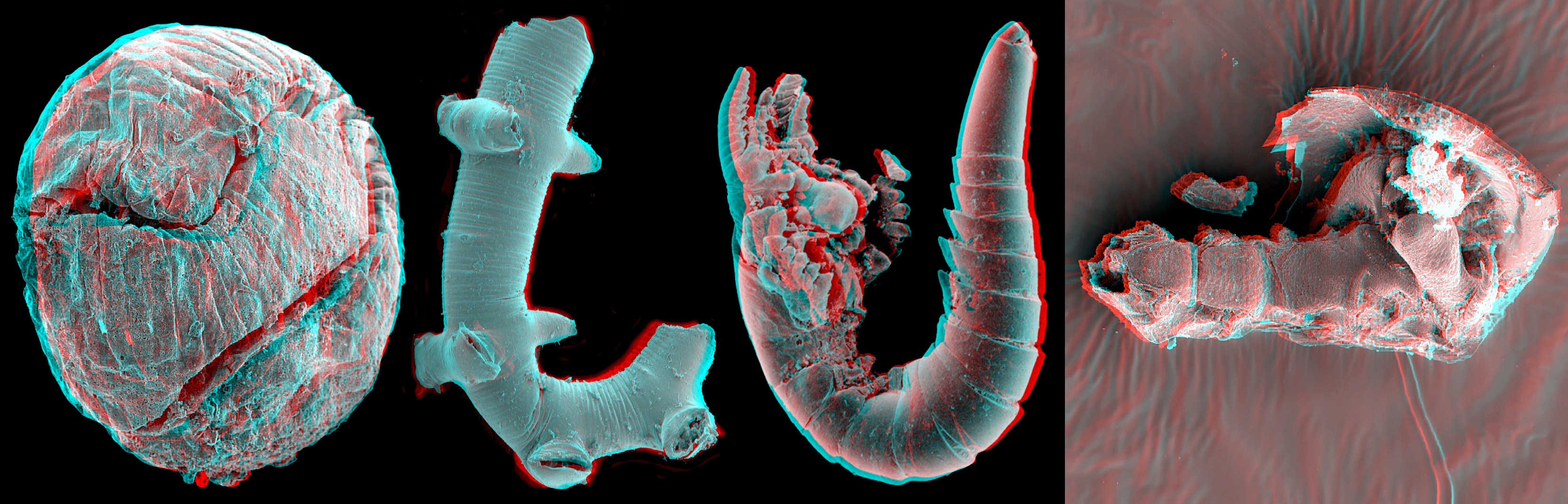 Already in the 1980s we had started to produce stereo images of our specimens. These were photographed at different tilting angles under the SEM and then combined to be viewed with special stereo spectacles. At that time it was fairly popular also to publish such stereo images, at least in the Palaeontology. The fixed angle at photography and fixed distance at combining the two images are, however, a problem for many people, who have problems to combine the images into a single stereo view when looking into the gap between the photographs. Point to point should be roughly 8–9 cm, but that does not work in the case of far-sighted people, me included. It should be noted that orientation of the objects is important as well as the relief. Our animals, arthropods or crustaceans, in particular have limbs that stick of from the surface, which diminishes the stereo effect. So, better a lengthwise oriented object than horizontally extended, a half sphere is as bad as a curved C. The very slim Skara was a bad object compared to others.