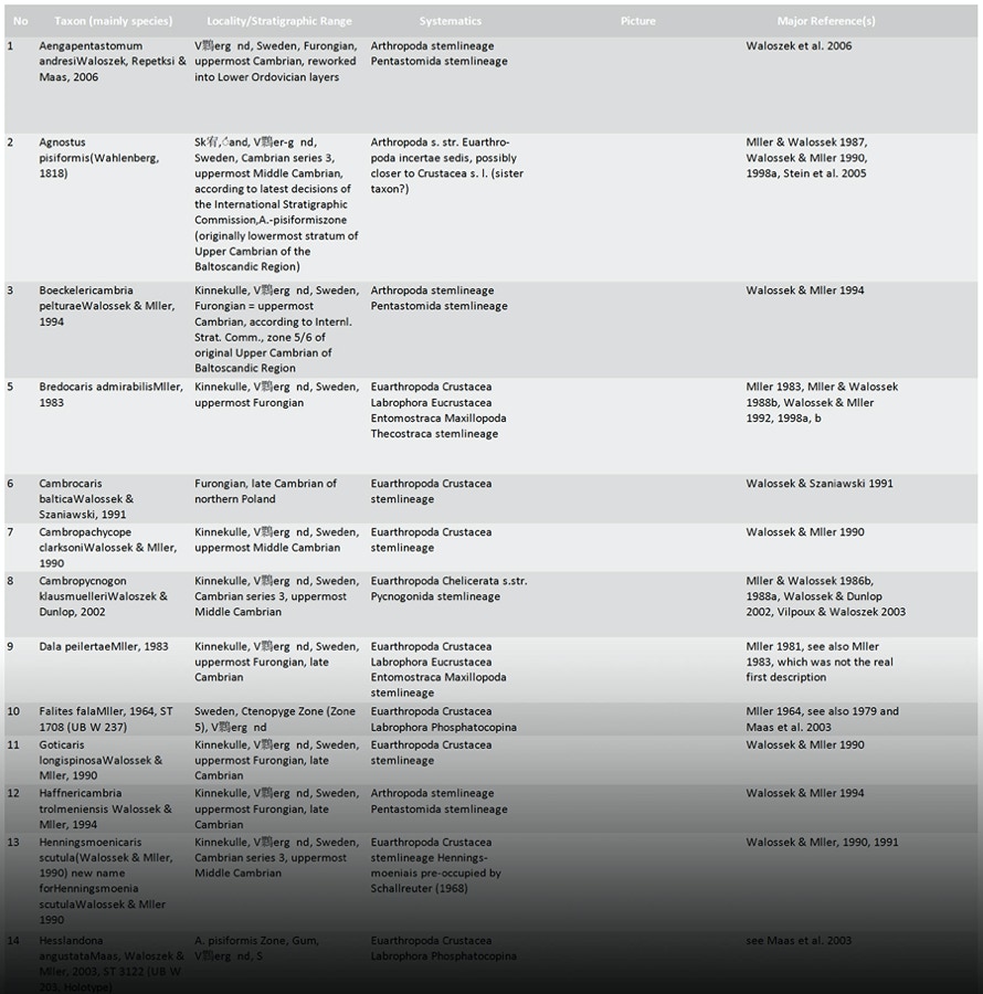Note that Agnostos pisiformis is different from the rest of 'Orsten' arthropods in so far that it has been known for long in form of its calcitic head and tail shields of the large specimens. What is still missing in this list are the cambrogeorginids, palaeoscolecids and more non-arthropods and small shellies, which will be added in due course.
